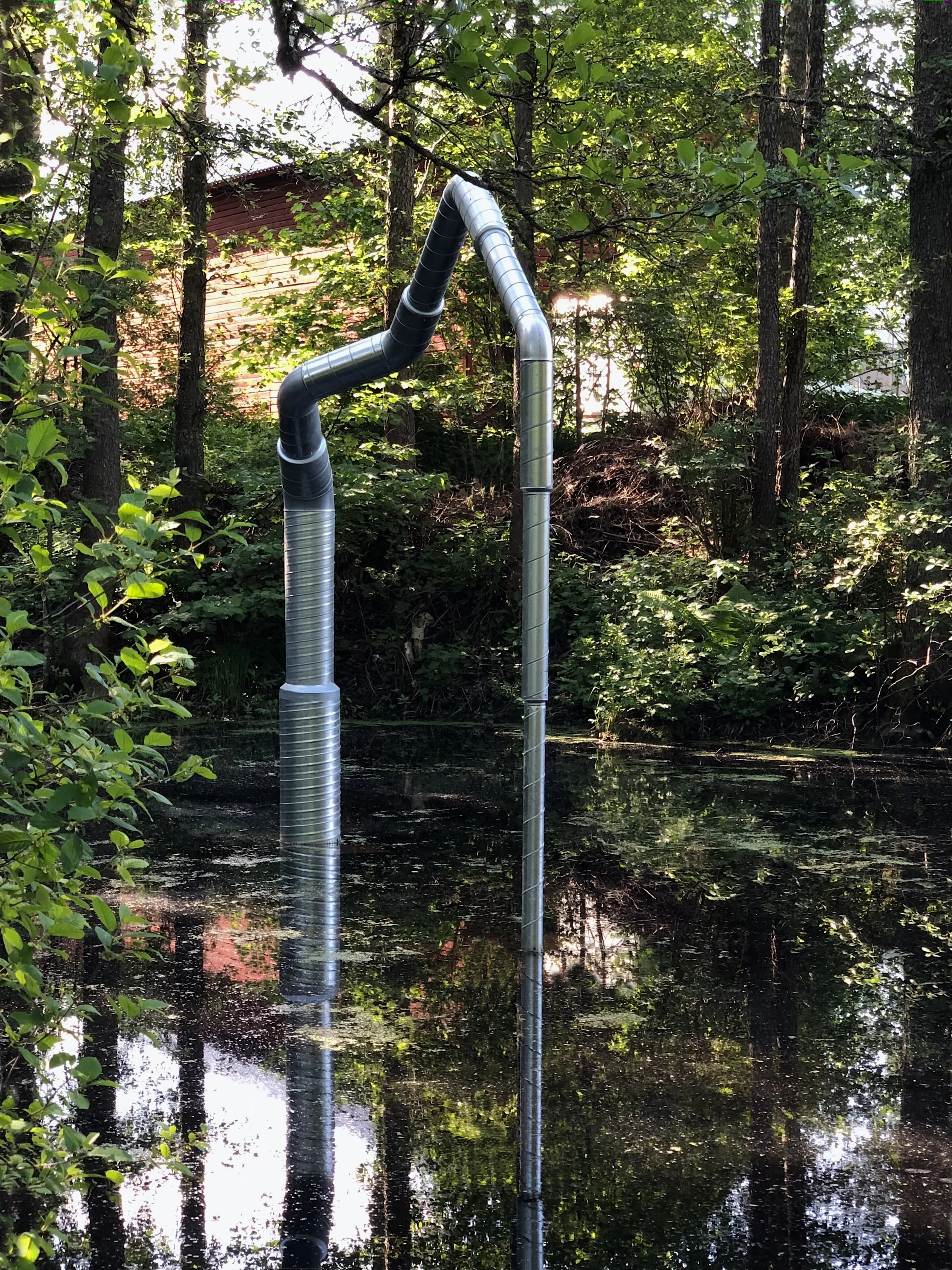 I en branddamm bakom oss har Åsa Lockner Contemporary Jewellery länge närt en dröm om att placera en skulptur. Den industriellt präglade portalen blir som en synliggörare av den lilla vattenspegeln som tillsammans med vegetationen runt omkring utgör nästan som en liten scen. Med den nyanlagda stigen som löper jämte så blir upplevelsen både väldigt tillgänglig och lätt att ta till sig för er som promenerar förbi.